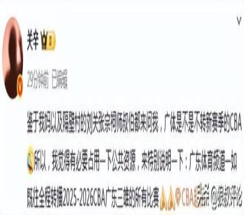 北京时间12月11日,根据广东体育频道记者“关辛”的报道,“鉴于我妈以及隔壁村的刘关张宗祠师叔伯都来问我,广体是不是不转新赛季的CBA[允悲]所以,我觉得有必要占用一下公共资源,来特别说明一下:广东体育频道一如既往全程转播2025-2026CBA广东三雄的所有比赛”