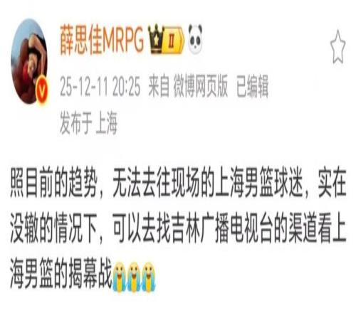 现在都2025年了,球迷居然还没有网络渠道观看国内最大的篮球赛事,这让很多球迷直呼不可思议。特别是上海男篮的球迷,由于上海男篮是新赛季的争冠热门之一,球迷们希望能够看到球员们每一场的表现,但却没有网络直播渠道。跟队记者薛思佳已经在社交媒体上呼吁上海球迷,去蹭其他球队的直播观看,就比如上海男篮首轮比赛的对手是吉林男篮,薛思佳就呼吁上海球迷可以通过吉林广播电视台观看上海男篮的这场比赛。